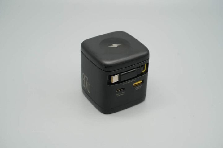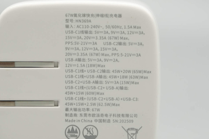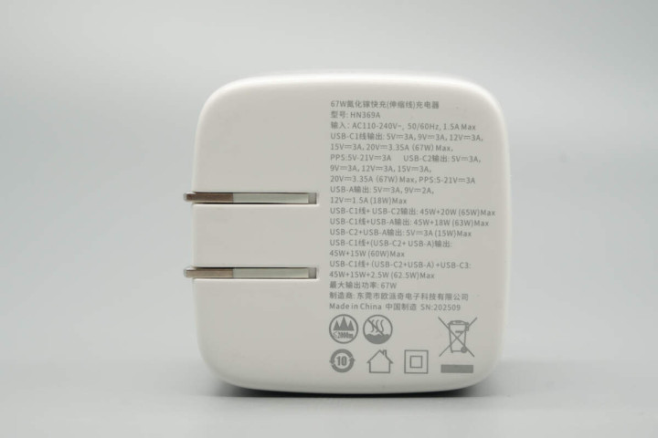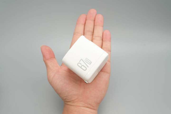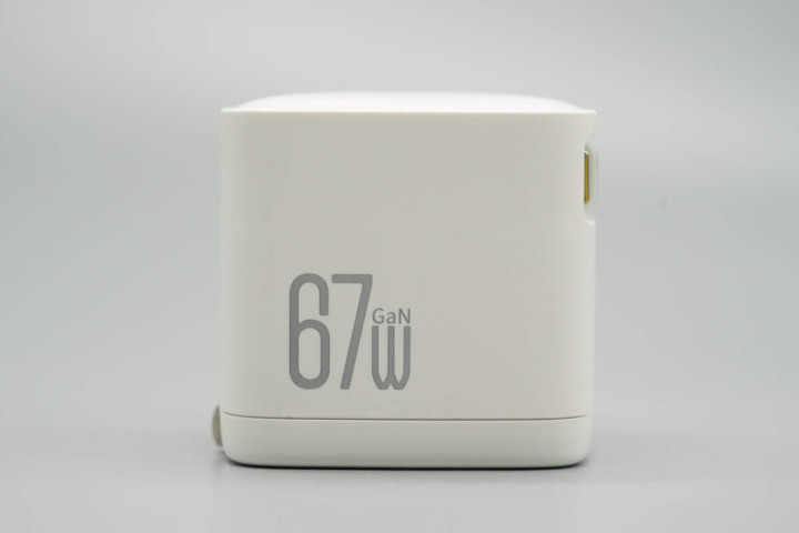 机身侧面印有67W GaN字样,表明这是一款氮化镓充电器。