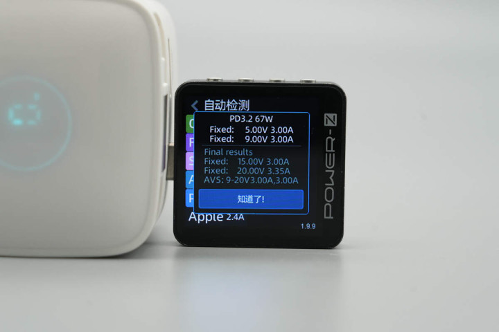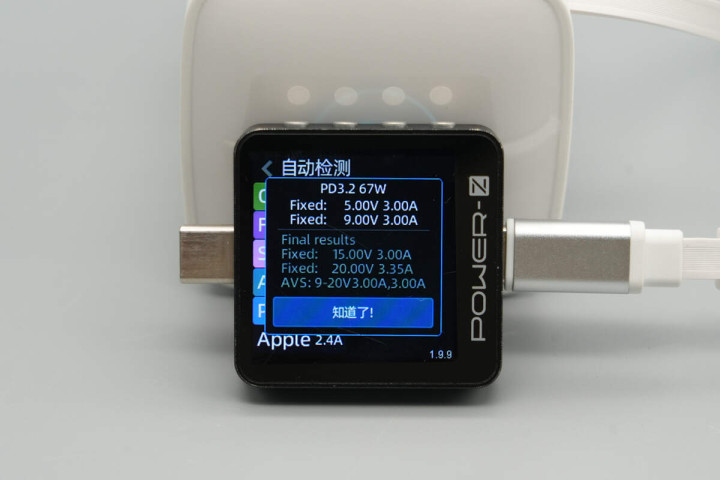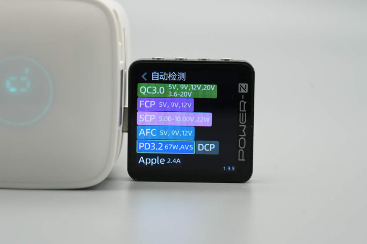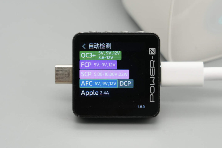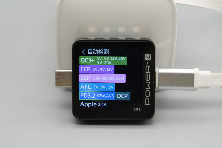 使用ChargerLAB POWER-Z KM003C测得充电器拉拉线输出支持QC3+、FCP、SCP、AFC、PD3.2、DCP、Apple 2.4A充电协议。