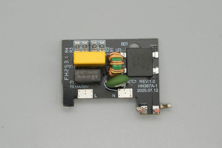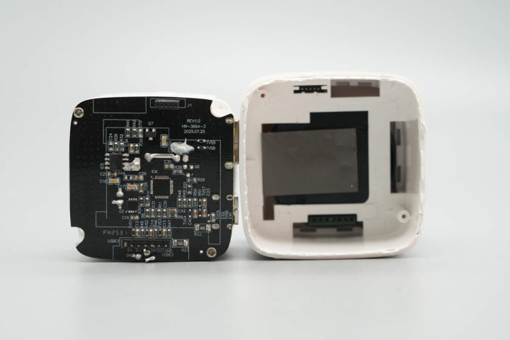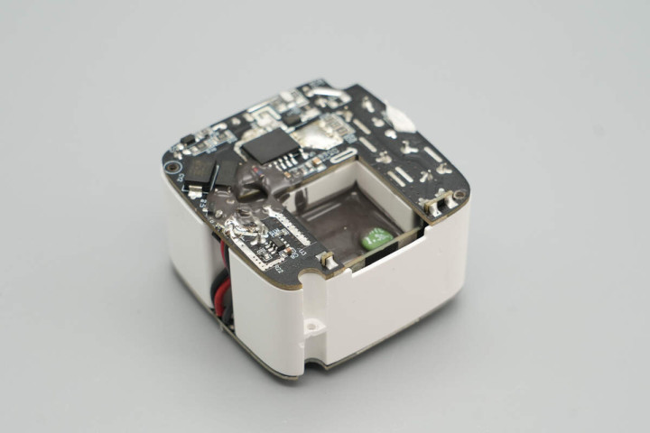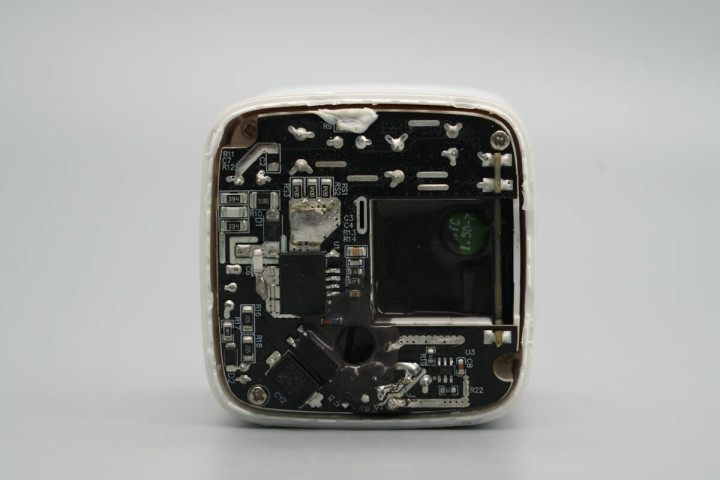 充电头网通过拆解了解到,产品内部除电源模块外,数显屏和拉拉线也模块化设计,有助于产品快速量产供应市场。电源模块由三块小板堆叠设计,采用塑料壳进行支撑隔离同时,还进行灌胶处理实现散热,做工可靠。