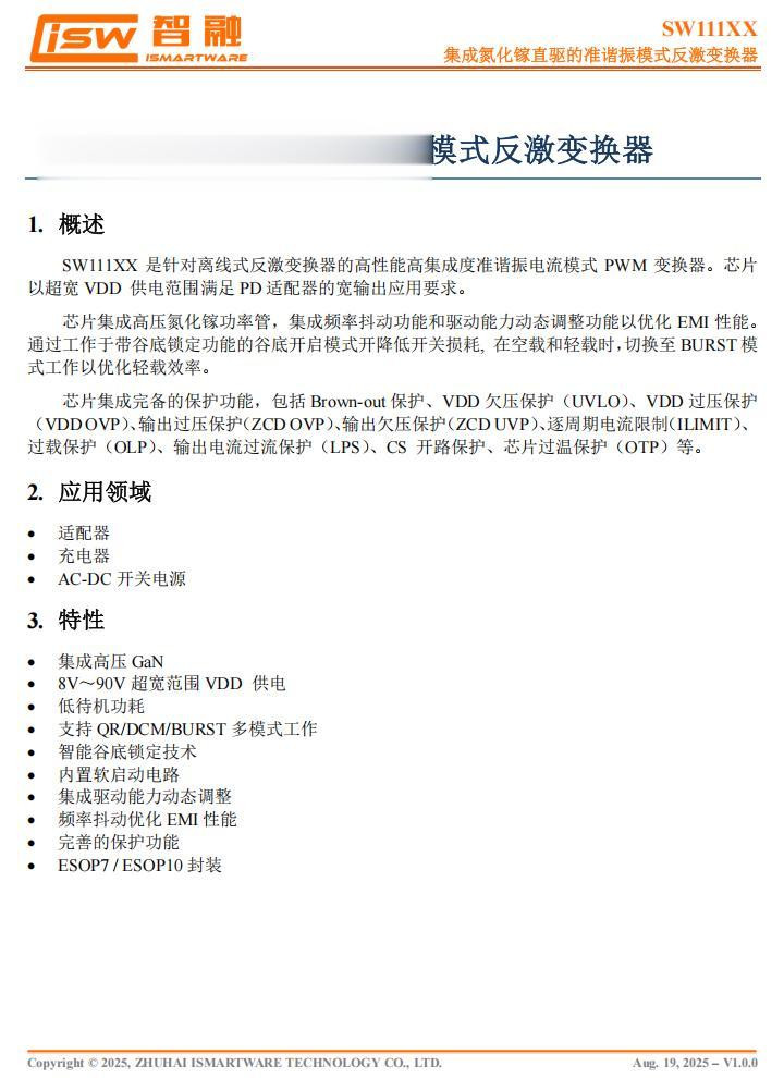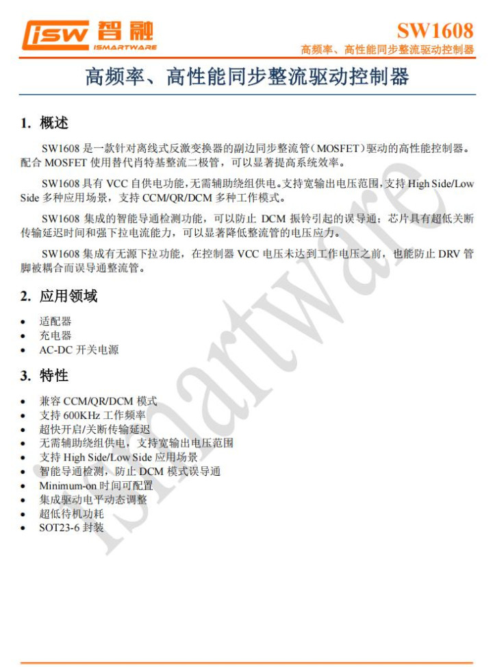 SW1608支持600KHz工作频率,并支持 High Side/Low Side 多种应用场景,支持 CCM/QR/DCM 多种工作模式。此外其内部集成智能导通检测功能,可以有效防止 DCM 振铃引起的误导通;芯片还具有超低关断传输延迟时间和强下拉电流能力,可以显著降低整流管的电压应力。