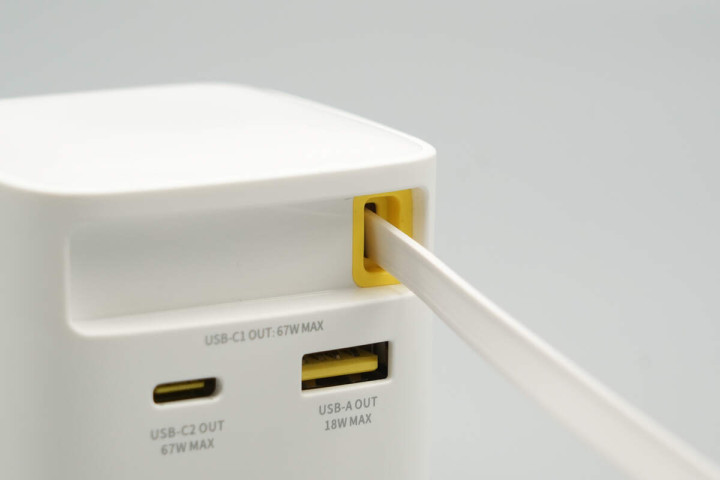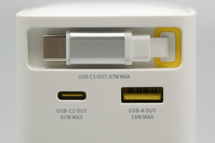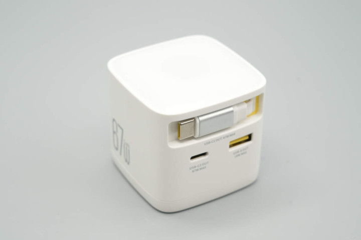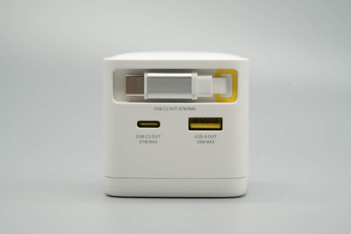 充电器采用PC阻燃材质塑料外壳,表面哑光工艺处理。机身正面配置USB-C1拉拉线和1A1C快充接口,并针对线缆端子设计磁吸收纳槽。