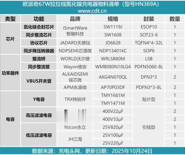 最后附上欧派奇67W拉拉线氮化镓充电器的核心器件清单,方便大家查阅。