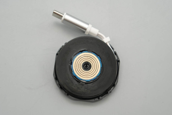 将充电器底部外壳拆开,输入端采用接触式通电设计。