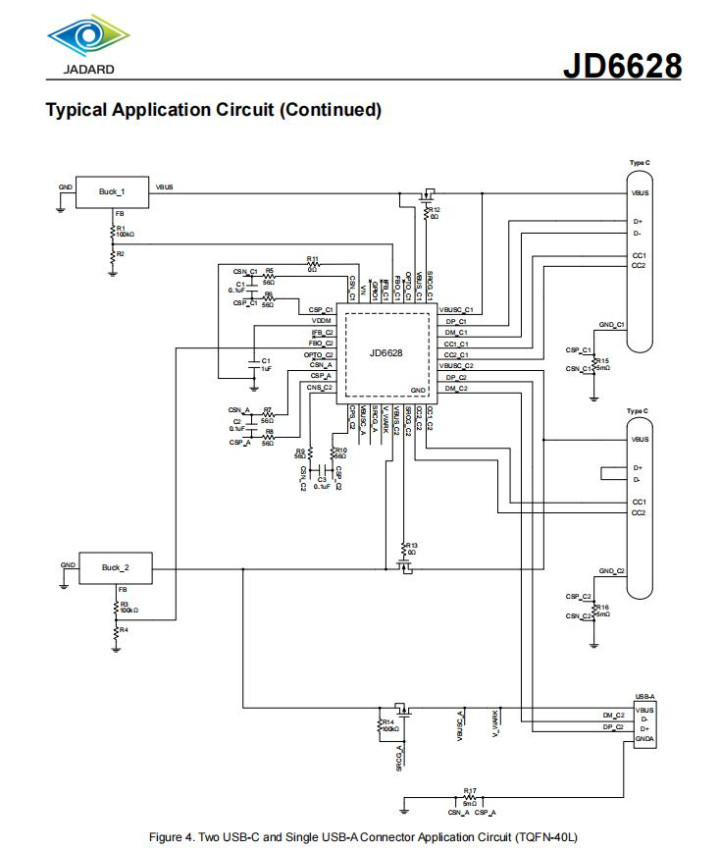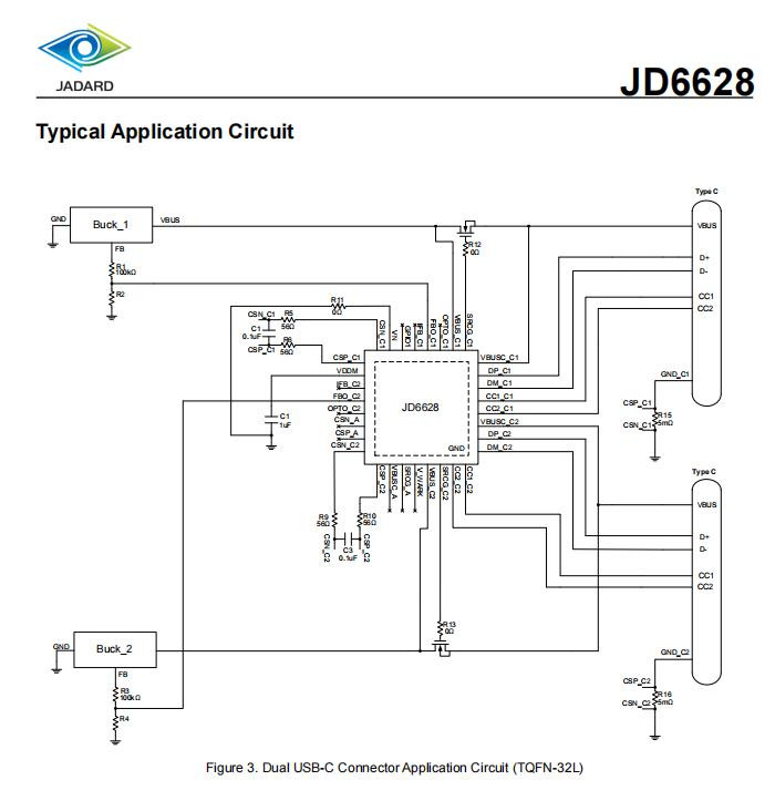 天德钰JD6628双USB-C接口典型设计线路图一览。