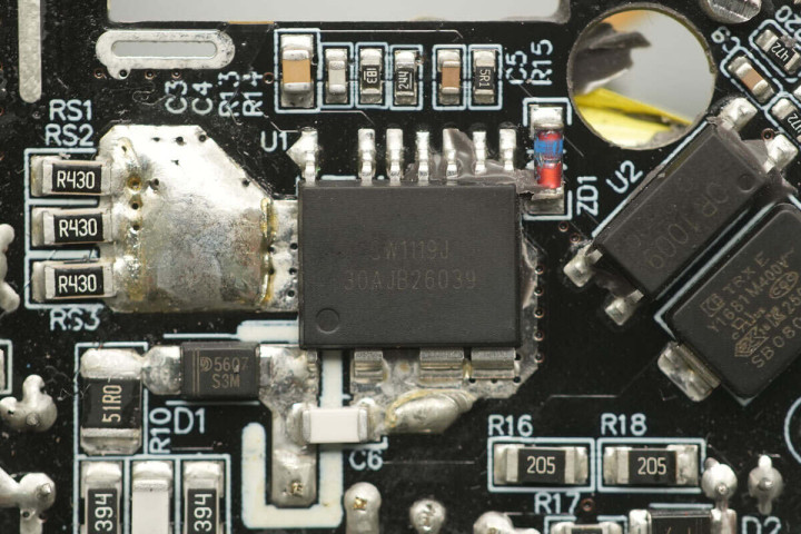 合封氮化镓芯片来自智融科技,型号SW1119J,这是一款针对离线式反激变换器的高性能高集成度准谐振电流模式PWM变换器。芯片以超宽VDD供电范围满足PD适配器的宽输出应用要求。