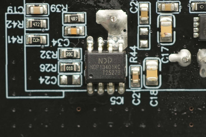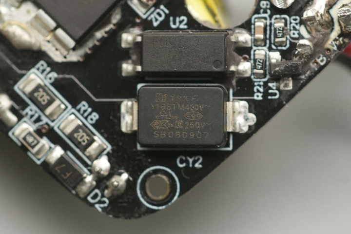 板子背面设有开关电源主控芯片、光耦、贴片Y电容以及同步整流控制器。