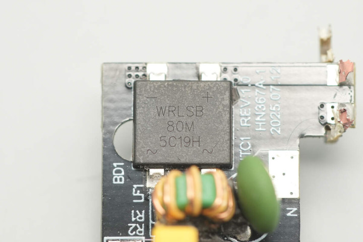 整流桥来自深圳市沃尔德实业有限公司,型号WRLSB80M,这颗软桥通过较软的恢复曲线,比较平滑的关断特性,可以降低二极管结电容达到非常少的谐波振荡产生的效果。选用的LSB封装,拥有良好的散热特性,帮助中大瓦数适配器提升可靠性,单颗可做60W+。