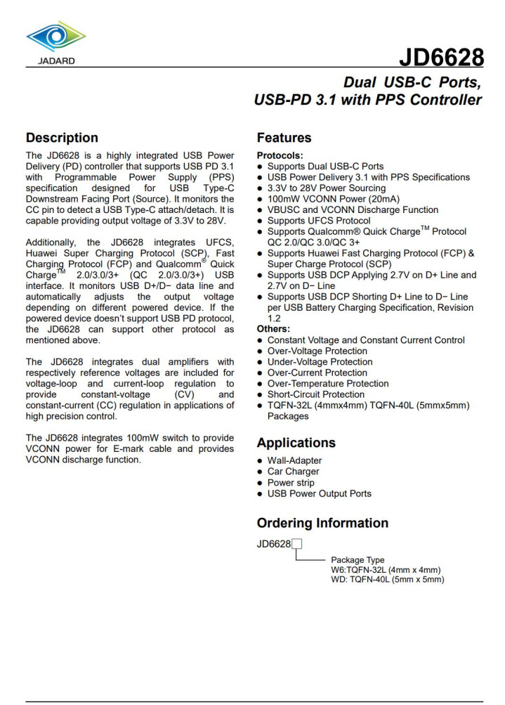 JD6628具备VBUS放电和VCONN放电功能,芯片内置过压保护,欠压保护,过电流保护,短路保护,过热保护。JD6628采用TQFN4*4-32L和TQFN5*5-40L封装,适用于快充充电器,车充等应用。