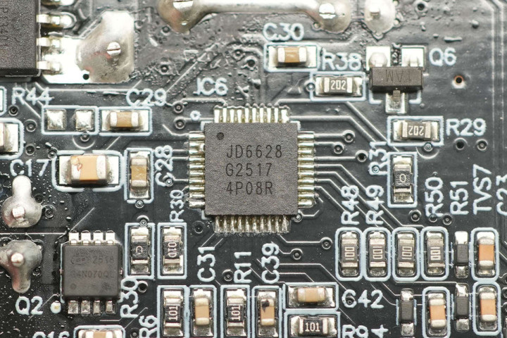 产品不仅使用了智融科技SW1119J+SW1608合封氮化镓电源方案,输出还使用一颗天德钰JD6628快充协议芯片实现三口输出控制,大幅简化了电路设计,同时接口兼容FCP、SCP、AFC、QC3+/5、PD3.2、PPS等主流快充协议,让产品拥有优秀的兼容性表现。