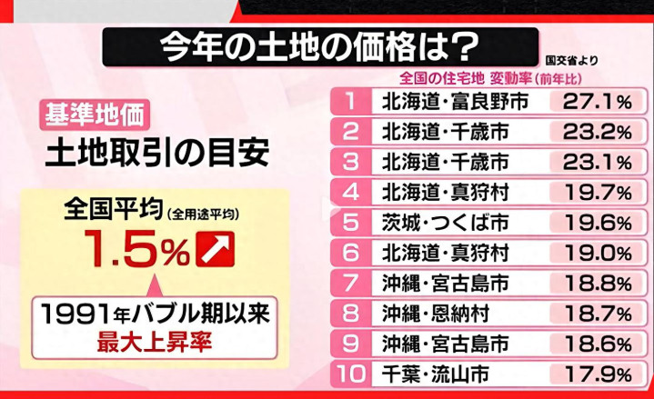 9月16日,日本国土交通省公布的数据显示,2025年日本所有用途土地的基准地价平均上涨1.5%。这是自1991年泡沫经济破灭以来的最大涨幅,也是日本地价连续第四年上涨。