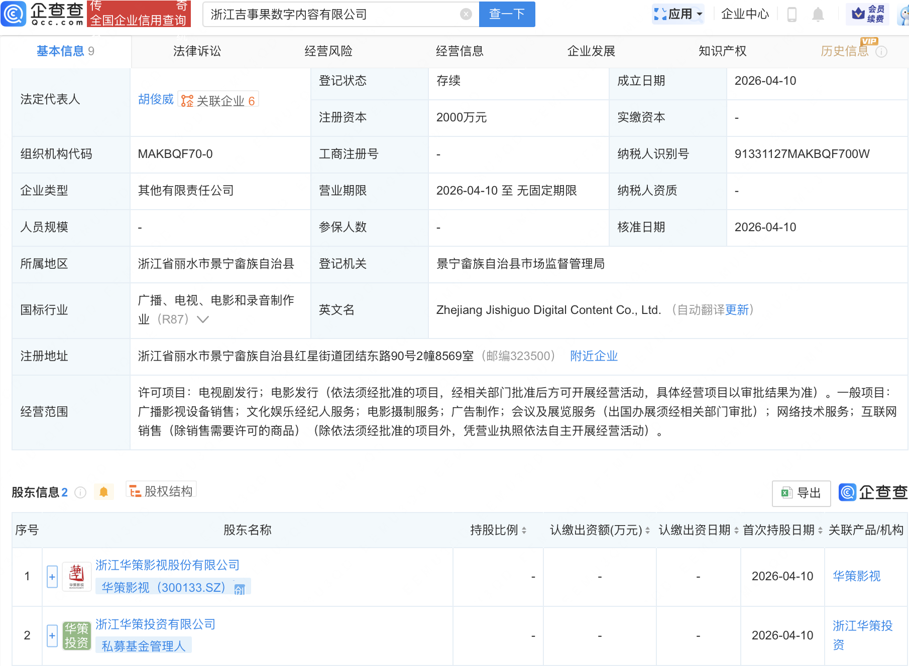 近日,浙江吉事果数字内容有限公司成立,注册资本2000万元,经营范围包含:广播影视设备销售;文化娱乐经纪人服务;电影摄制服务;广告制作等。企查查股权穿透显示,该公司由华策影视(300133)等共同持股。