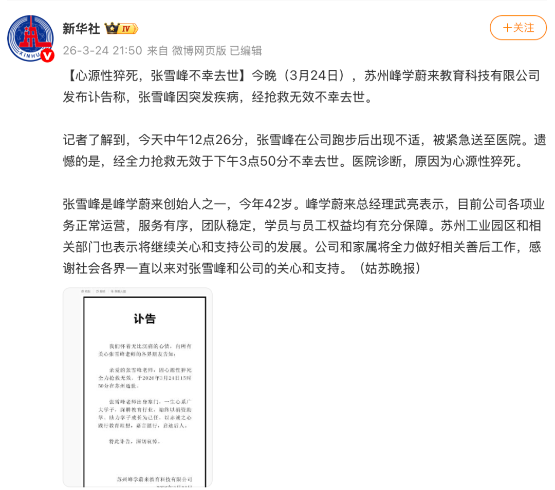 3月24日,苏州峰学蔚来教育科技有限公司发布讣告称,张雪峰因突发疾病,经抢救无效不幸去世。